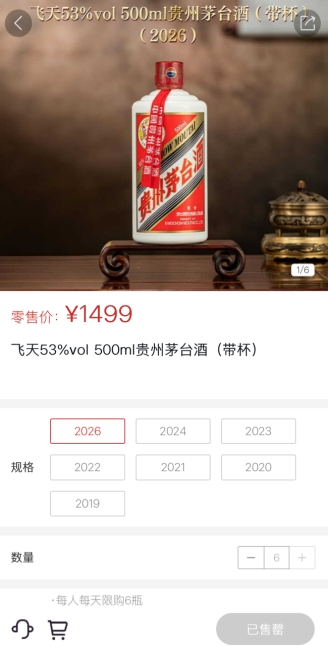 日前,i茅台APP一度登顶苹果App Store应用商店免费购物榜。《经济参考报》记者发现,自2026年1月1日飞天茅台酒上线“i茅台”APP以来,已连续多日“上线日上午,记者在“i茅台”APP看到,2026年份、定价1499元的500毫升飞天茅台酒显示“已售罄”;在其他购物平台上,2025年份的该款酒近90天同款均价为1908.36元。此外,马年生肖酒的预约通道也都显示名额已满。截止至发稿前,“i茅台”APP在App Store免费应用排行榜上排名第6,在免费购物排行榜上名列第二位,仅次于抖音商城。